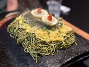 その上、上の方は割と普通の茶そばで、具が乗っているのに対して、下の方は瓦で焼かれてパリパリの食感。ただし他の店ではもっと瓦にが熱くて、そばがバチバチ言うらしいが、この店は瓦の温度が低い様でそこまでクリスピーでは無かった。残念!