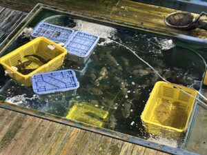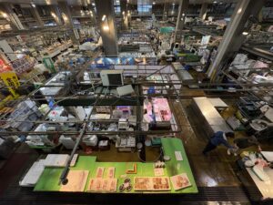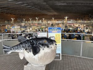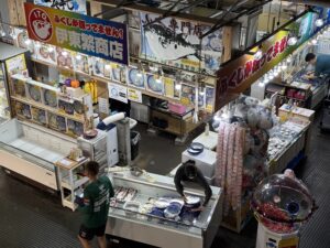 食後は市場1階の鮮魚店でフグ、クエ、ひらめのお造りをお土産に購入。保冷剤を付けてアルミ蒸着のプチプチ袋に入れてくれたが、羽田空港から家までが日中で時間も長いのでちょっと心配。場内の梱包材屋で発泡スチロールの魚箱を買って中に入れる。これを機内持ち込みにする。