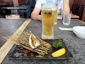 山口旅行最後のふく。やっと日中にビールが飲める。