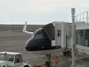 羽田の空路が混んで離陸が15分ほど遅れたうえに、羽田空港手前で大回りして時間調整。20分以上遅れて到着。