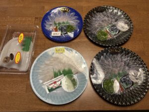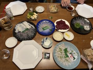 • 夕食は、家でお土産のフグ、クエ、ひらめのお造り(☆☆☆☆)