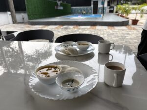 朝食はイドリ、サンバル、そしてココナッツチャツネ。