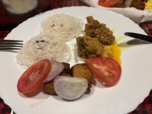 フィッシュ・フライにチキン・カレー、それにケララの主食の一つイディアッパム (Idiyappam)。フィッシュフライは大きな魚の切り身をサイコロ状に切って揚げたもの。カレーはとろみのないグレービーで、両方とも辛くない。この家はあまりスパイスを入れずに優しい味付けの様だ。