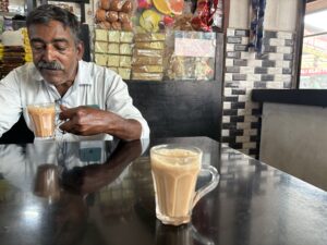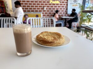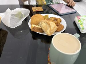 - 朝食は、昨日買ったインドスナックと紅茶を共用部のダイニングで