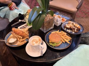 朝食なのでハンバーガーを1個ずつと、定番のラムのグリルとフィッシュ&チップス。お飲み物はカプチーノとジンジャエール。フライドポテトは勿体無いがほとんど食べられなかった。